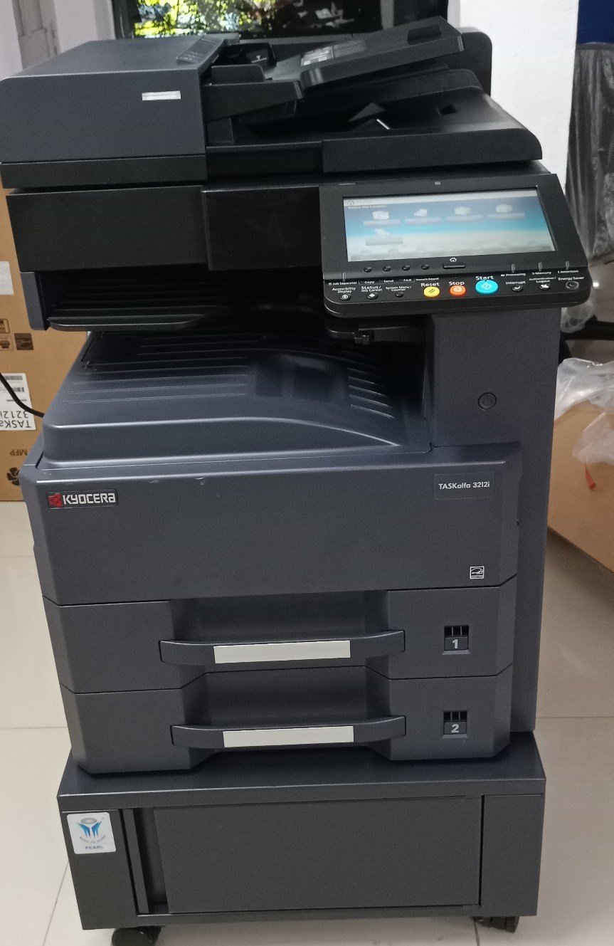 Kyocera Taskalfa 3200i Photocopier Machine 32 CPM Copier Network Printer Network Color Scanner WIFI Mobile Printing By Pass Tray 100 Sheets Scan to Folder, Pen drive 500 Sheets Paper Tray*2 25% to 400% Zooming Multiple copies1-999 Drum Life up to 6 Lakhs Copies Duplex, RADF & Trolley Power Consumption 510 W A5R, A4, A4R, LGL & A3 Color Touch Screen Mobile Printing & Cloud Printing Sky Shot Ram 2GB 32GB SSD